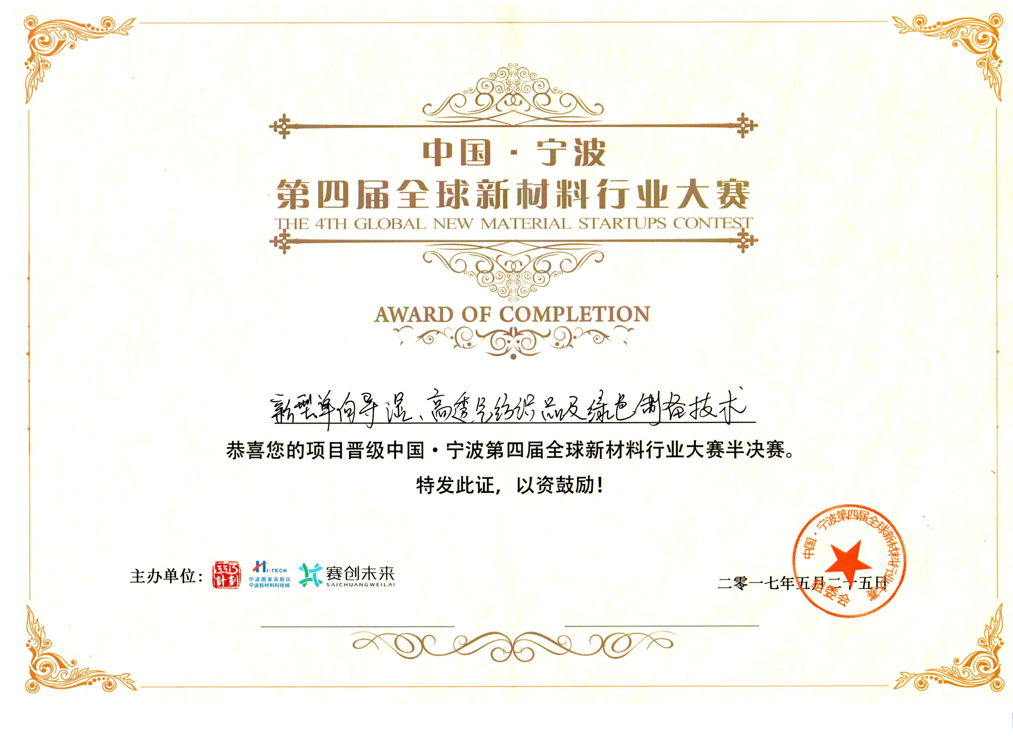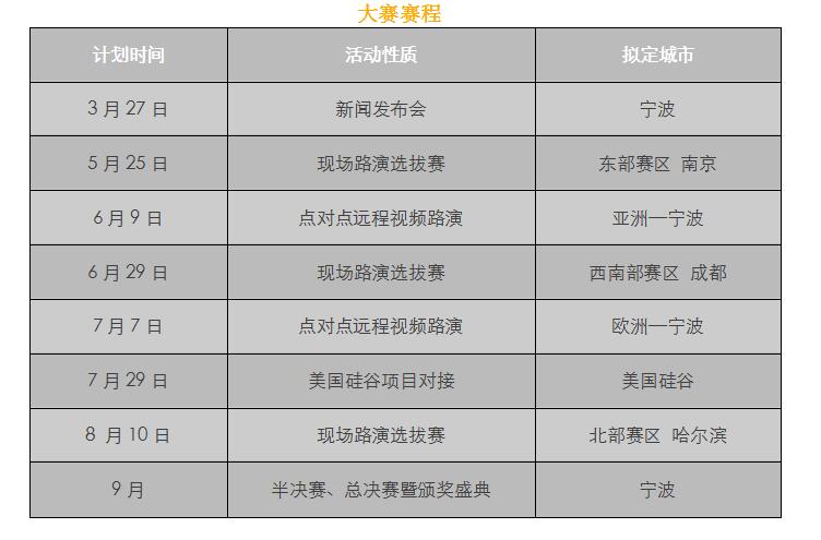 本届大赛面向全球重点产业区域征集创新创业项目,大赛前5名项目可直接入选宁波市“3315计划”评审环节,获得最低200万元,最高4000万元政策奖励。据介绍,本届大赛将放眼国内外重点新材料城市,除了华南、华中、华北三个国内赛区之外,大赛还将全新搭建“新材料科技城全球路演中心”平台,与亚洲、欧洲赛区点对点远程视频路演。今年7月,大赛还将登陆全球创业者心中的圣地--美国硅谷,在创业第一线寻找优秀创业者。经过初审、选拔赛、半决赛及决赛四个环节,晋级半决赛40个项目,最终角逐大赛10强。今年9月在宁波将进行半决赛、总决赛暨颁奖盛典。