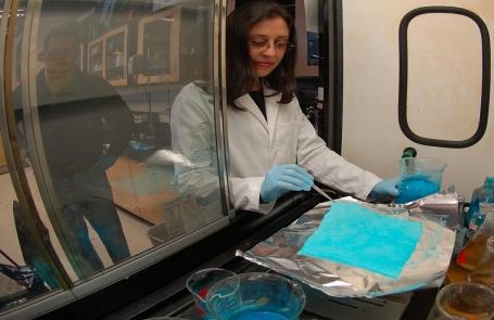 “这个课题使用碳纤维制作晶体管和其他组件,为电子产品与纺织物的无缝连接带来了一个新的视角,从而为独特的可穿戴电子设备的产生提供了可能。”艾斯特罗扎说。利用棉的不规则形貌,研究人员在天然棉纤维中加入含有纳米金颗粒的保形涂料和半导电及导电聚合物,以调节其性能。不仅如此,研究人员还用导电棉线制作出一种可以为iPhone手机充电的衣服:将超薄的太阳能电池板裁剪成适当的形状并将USB充电插口埋在腰部,在西南方向受到激发的衣物可以捕捉到足够的阳光为手机和其他的手持设备充电。这项技术可以嵌入衬衫中测量心率和分析汗液,缝入枕头检测大脑信号,或者应用于具有加热和制冷功能的交互式纺织产品。另外,合成纳米颗粒并且把它们附在棉布上,不仅可以在不用染料的情况下对其表面进行着色,而且新的表面可以杀死99.9%的细菌,这可以用于预防感冒、流感和其他疾病。艾斯特罗扎的两个学生使用金属有机骨架分子,制作了一个带着兜帽的紧身衣,以抵御携带疟疾病毒的蚊子。其他学生也使用金属有机骨架制作了能够以特定方式俘获有毒气体的面具和头巾。“我们希望利用这些分子的力量吸收气体并将金属有机骨架混入纤维中,这样,我们就可以制造出非常有效的过滤系统。”艾斯特罗扎解释说,他们还经常寻找可以将棉布做成帆布的新方法,以使其具有无限的现代用途。