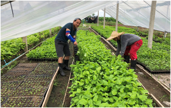 陆小平教授(右)指导老方人员开展穴盘培育桑苗生产