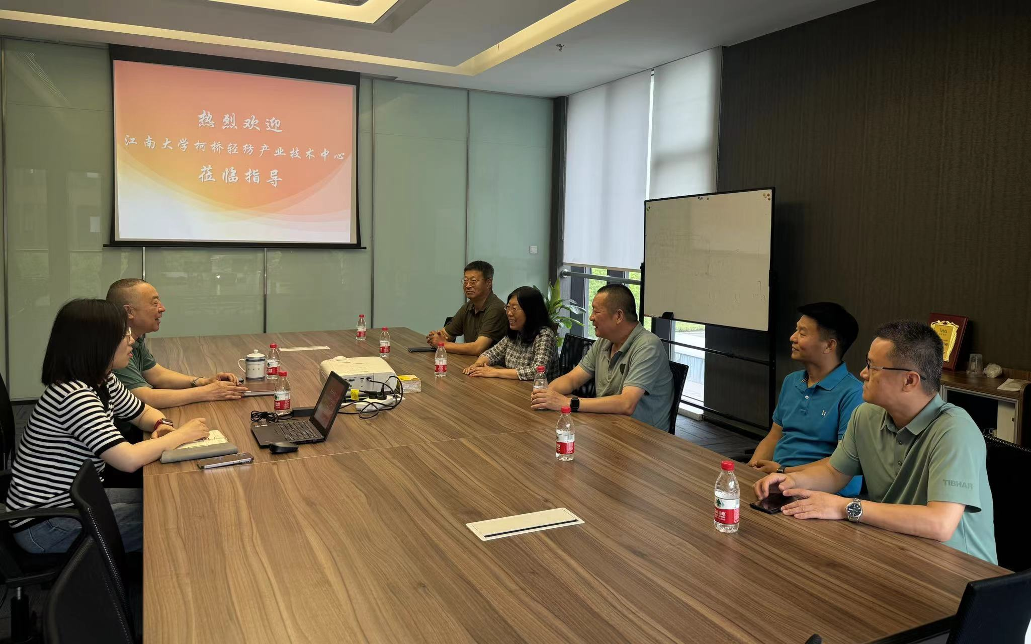 6月5日,江南大学柯桥轻纺产业技术中心主任王潮霞教授、副主任蒋少军教授一行来研究院访问交流。研究院特聘教授陈志华、研究院科研部副部长林楚楚参加了交流。
